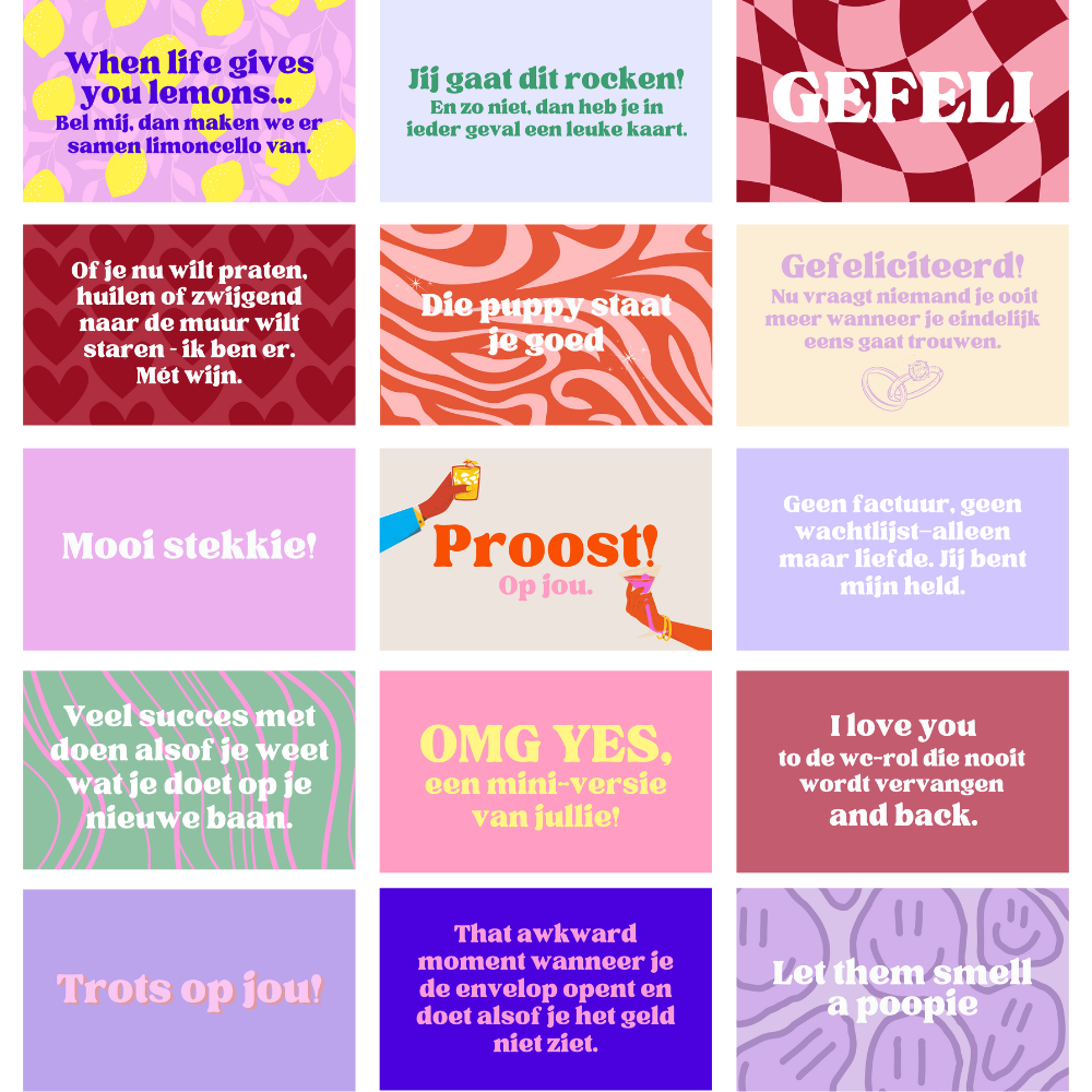 Een kaart voor elke situatie. Van liefde tot een nieuwe baan, en van ‘veel succes’ tot ‘ik denk aan je’. Deze Mix Set is allesbehalve standaard: droog, grappig en een beetje brutaal. Perfect voor iedereen die liever “I love you to the wc-rol die nooit wordt vervangen and back” zegt dan een cheesy liefdesquote.
