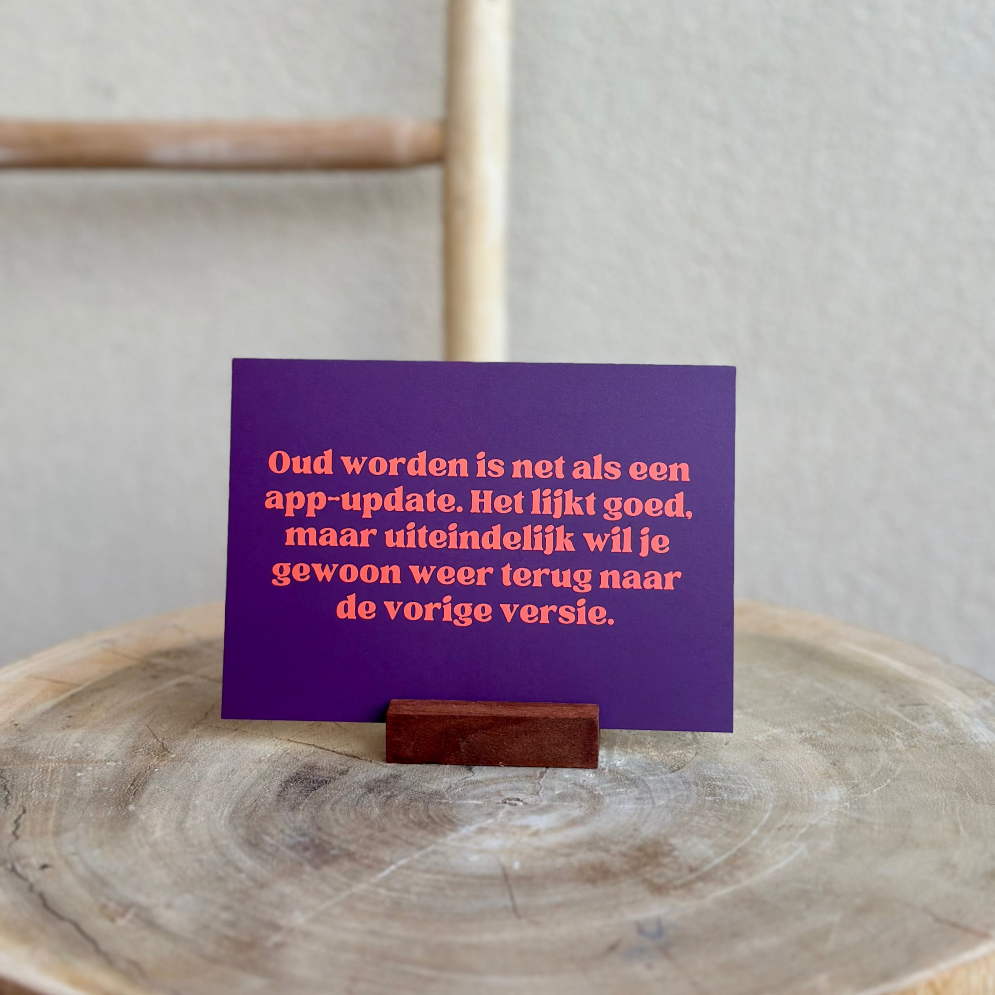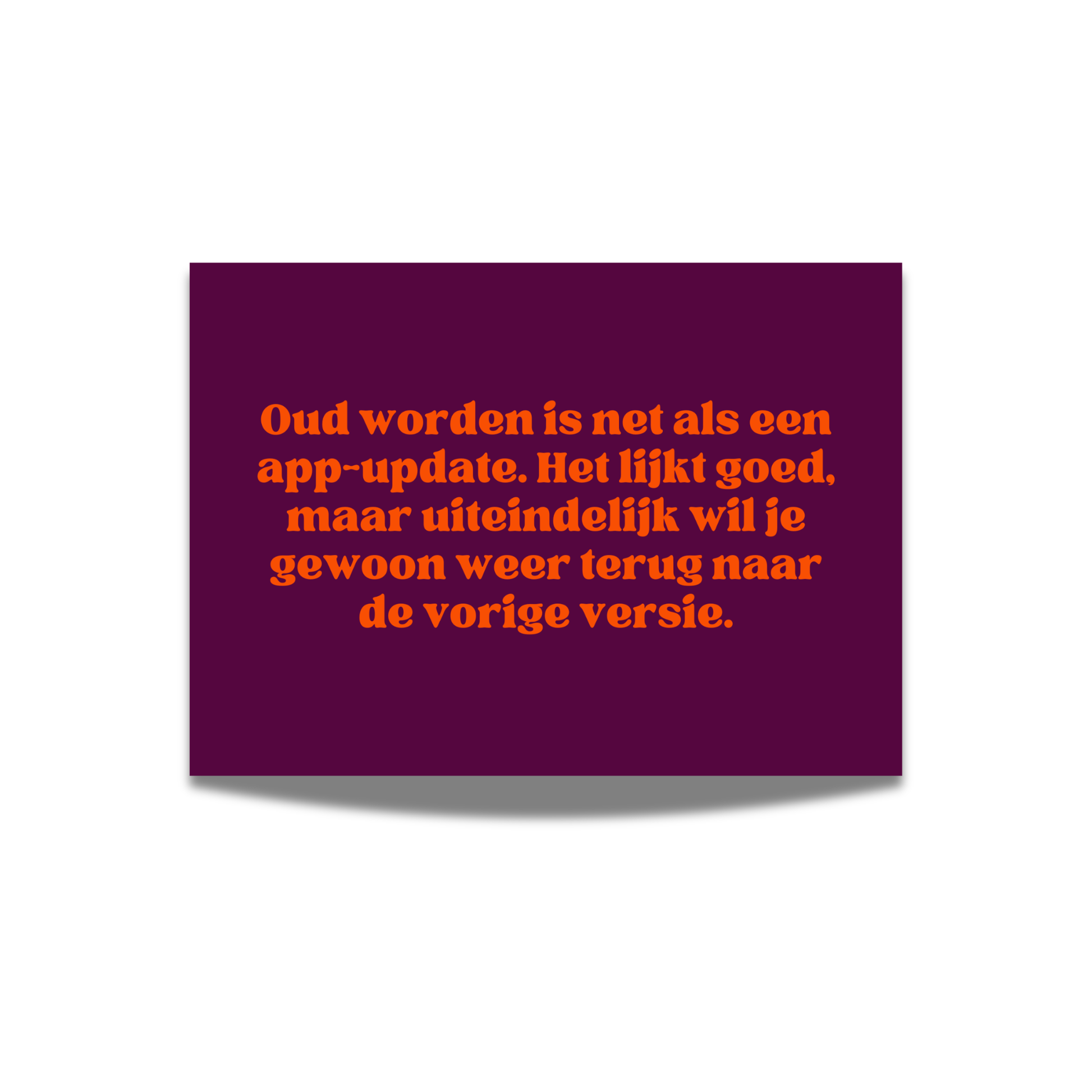 Een grappige en herkenbare verjaardagskaart: “Oud worden is net als een app-update. Het lijkt goed, maar uiteindelijk wil je gewoon weer terug naar de vorige versie.” Perfect voor vrienden, familie of collega’s die hun verjaardag met humor en zelfspot willen vieren.