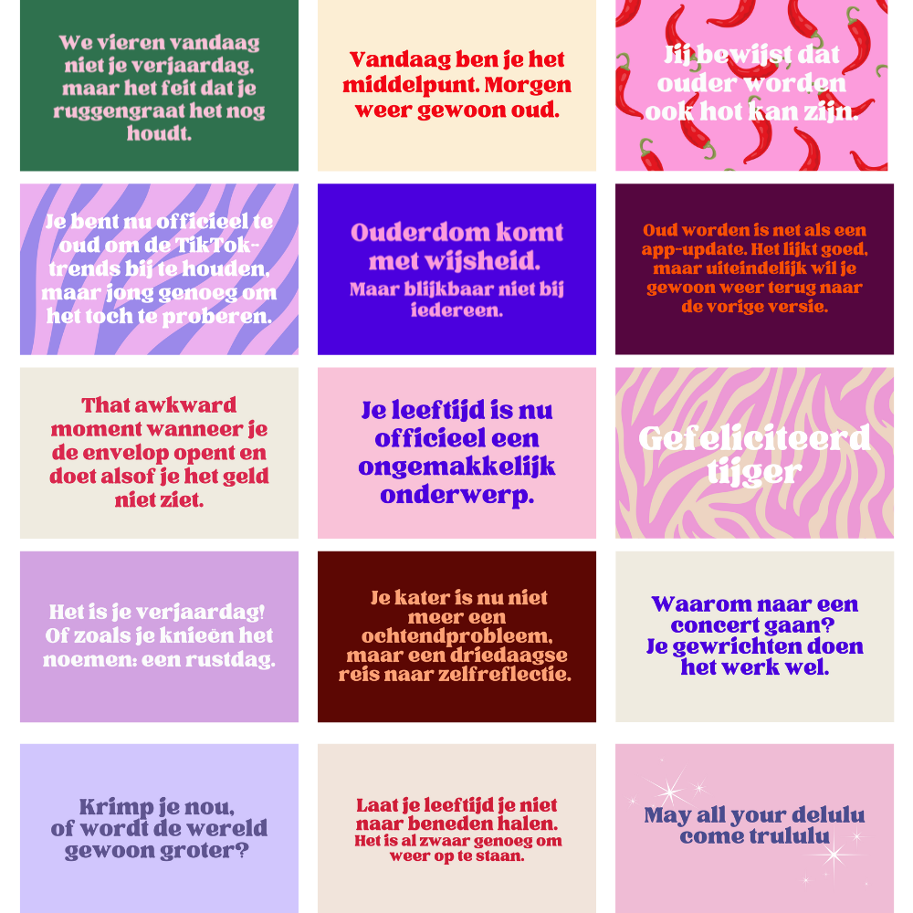 Verjaardagskaarten, maar dan zonder de clichés. Vergeet de standaard kaarten met ‘hieperdepiep’. Deze set is gemaakt voor iedereen die weet dat ouder worden vooral betekent: rugpijn, een kater die drie dagen duurt en grapjes over hoe wijs je zogenaamd bent.